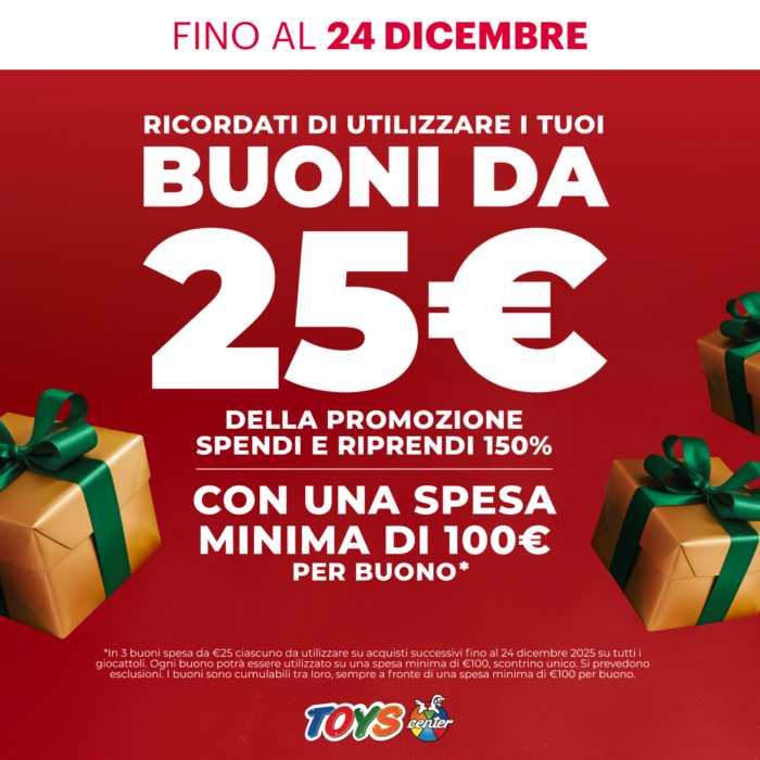 Da oggi fino al 24 dicembre puoi spenderli per i tuoi acquisti di giocattoli, con una spesa minima di 100€. Il momento perfetto per fare i regali di Natale.