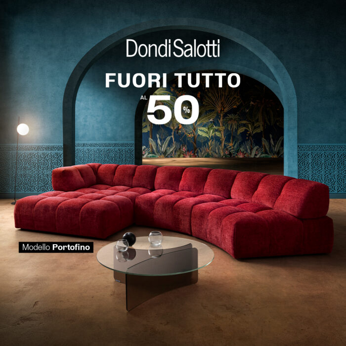 Fuori Tutto -50%”, valida dal 23 febbraio al 26 aprile 2026. La campagna prevede uno sconto del 50% sul prezzo di listino applicato all’intera collezione di divani, poltrone e pouf, se realizzata in qualsiasi composizione nei rivestimenti denominati «Promo Selection»