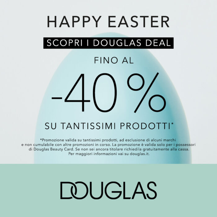 *La promozione è valida fino al 6 aprile 2026 su tantissimi prodotti, ad esclusione di alcuni marchi e non è cumulabile con altre promozioni in corso. La promozione è valida solo per i possessori di Douglas Beauty Card, per maggiori informazioni vai su douglas.it.