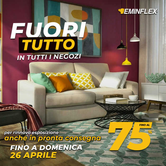 Eminflex – Fuoritutto Fino al 26/04 Ma lo sai che da Eminflex è tornato il Fuoritutto? Hai capito bene! Tantissimi articoli scontati fino al 75% e moltissimi anche in pronta consegna! Vieni, guardi e porti a casa subito. Ti aspettiamo in negozio, ma solo fino al 26 aprile.
