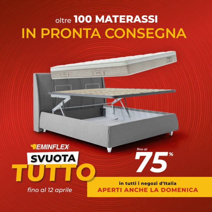 Da Eminflex è arrivato lo Svuotatutto! É il momento giusto per rinnovare tutta la camera da letto a prezzi eccezionali, grazie a tantissimi prodotti scontati fino al 75%, anche in pronta consegna. Corri in negozio entro il 12 aprile, ti aspettiamo