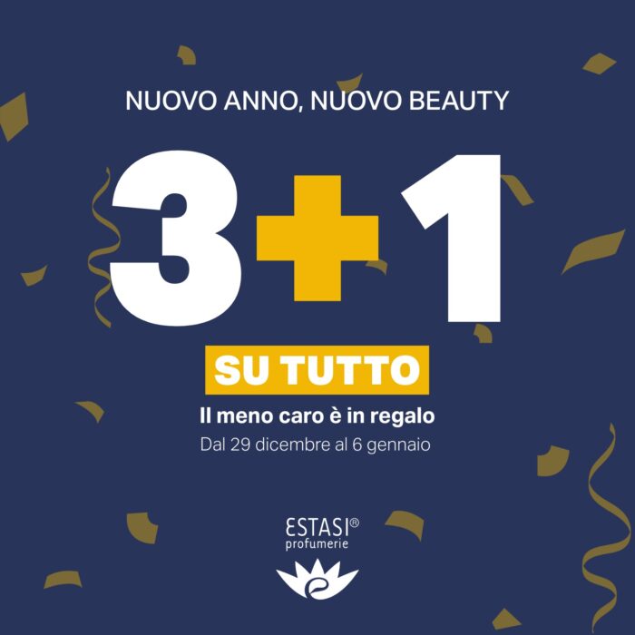 Inizia il 2026 con una scorta di bellezza! Fino al 6 gennaio promo 3+1 su tutto: prendi 4, paghi 3 su profumi, skincare, make-up e anche cofanetti regalo. Il prodotto meno caro è in regalo.