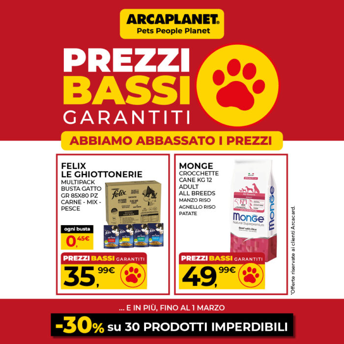 Da Arcaplanet abbiamo abbassato i prezzi! Scopri subito i Prezzi Bassi Garantiti nei nostri store. E in più, fino al 1° marzo, -30% su 30 prodotti imperdibili